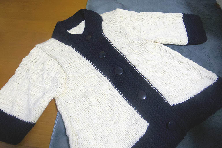 縄編みがまたきれい。ボタンホールまでついてるなんて、すごいわ~!