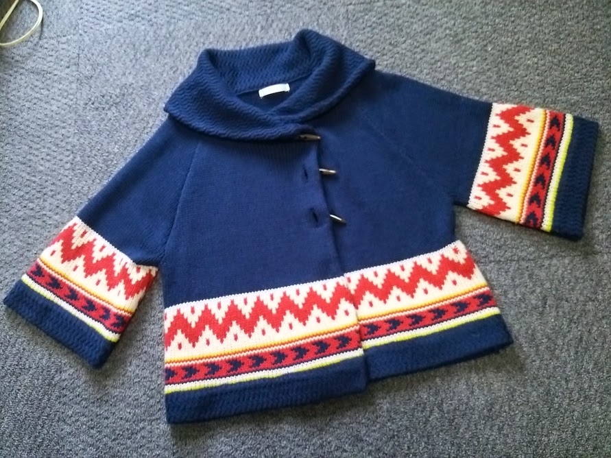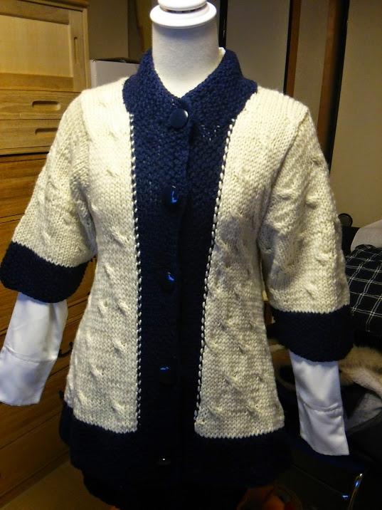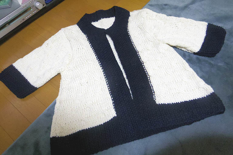 縄編みがまたきれい。ボタンホールまでついてるなんて、すごいわ~!